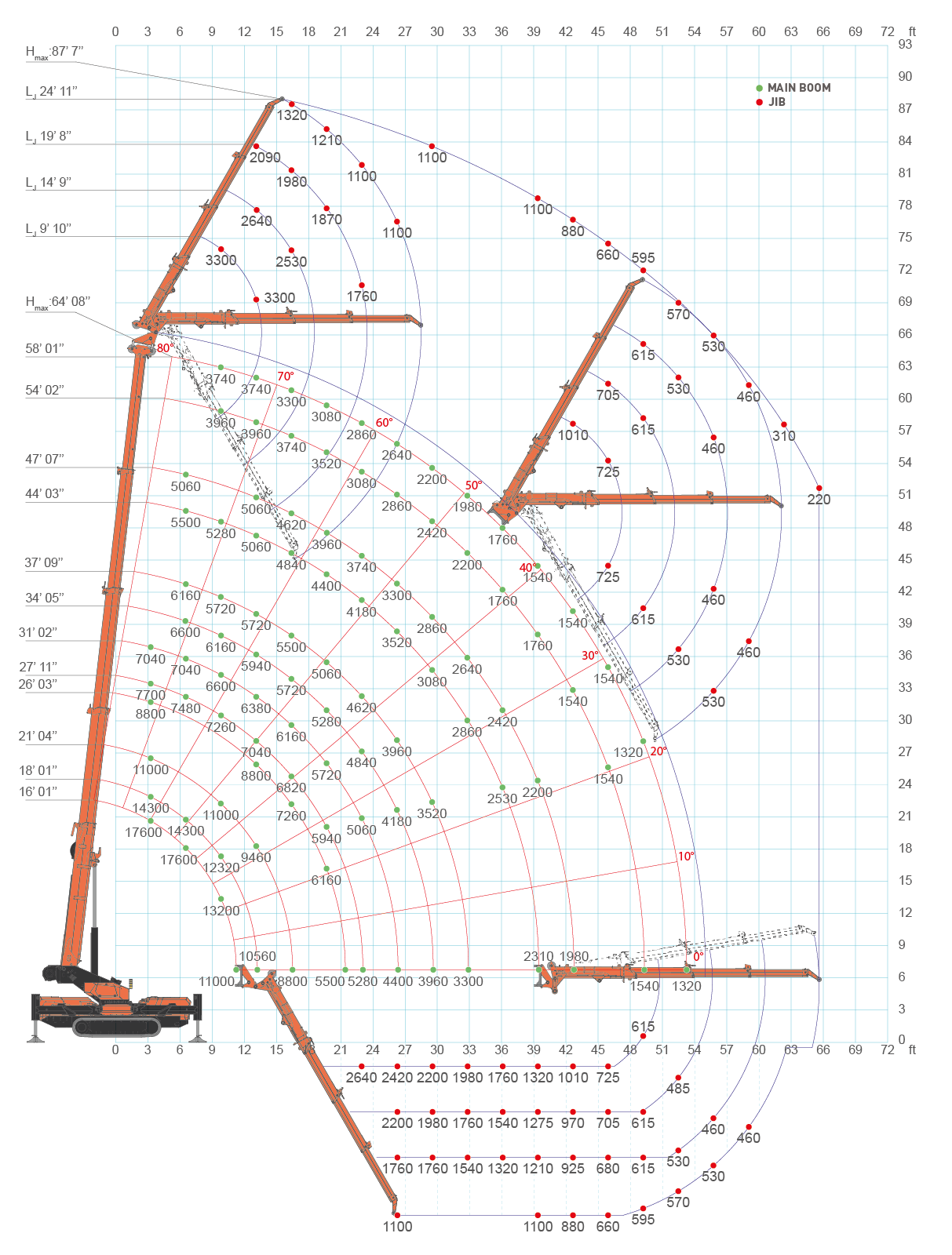 Crawler crane, reduced stabilization area, 17,637 lb max capacity and 87′ 7” max working height: a mini crane with unique features which make it incomparable on the market.
